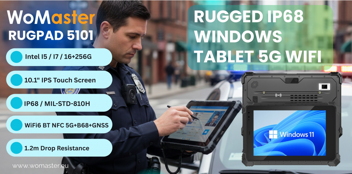 The WoMaster RugPad 5101 is a rugged Windows 11 tablet designed for demanding industrial and field environments. Powered by an energy-efficient Intel i5-10210Y quad-core processor with 8GB DDR memory and a 128GB SSD, it delivers strong performance while maintaining low power consumption. Its 10.1-inch 1920×1200 display offers 700 cd/m² brightness and a 10-point G+G touch screen with ≥7H hardness, supporting operation with medical rubber gloves for specialized applications.